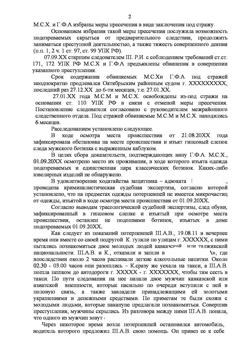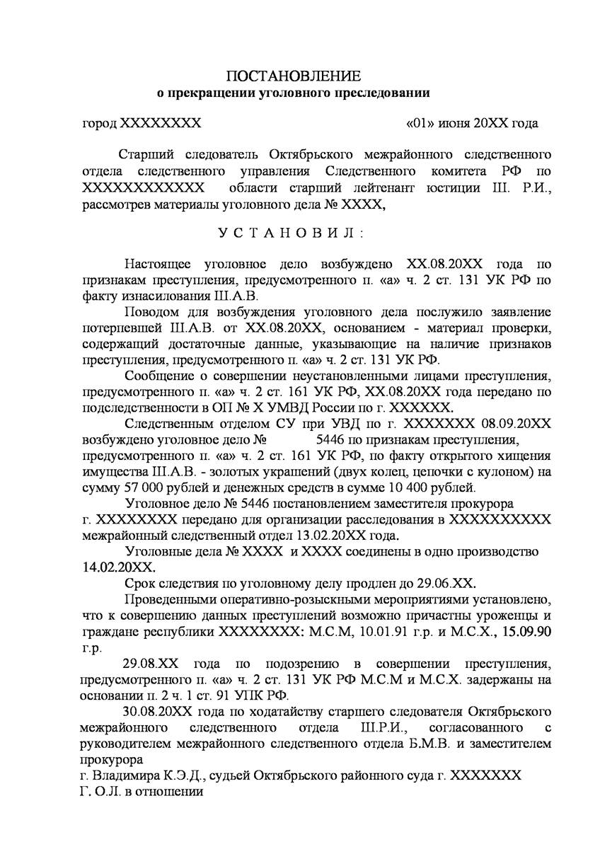 Адвокат в Екатеринбурге добился прекращения уголовного дела на стадии предварительного расследования по реабилитирующим основаниям в отношении двух граждан иностранного государства обвиняемых органами предварительно следствия в совершении преступления предусмотренного п. «а» ч.2 ст.131 УК РФ (изнасилование совершенное группой лиц) и п."а" , п."г" ч.2 ст.161 УК РФ (грабёж), наказание за которое предусматривает лишение свободы от восьми до пятнадцати лет, то есть преступление, которое в соответствии с ч.5 ст.15 Уголовного Кодекса Российской Федерации отнесено к категории особо тяжких преступлений.